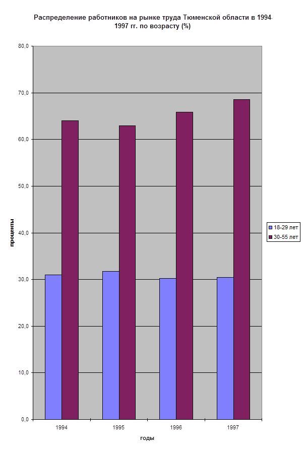 3. Диаграмма распределения работников на рынке труда Тюменской области в 1994-1997 гг. по возрасту
