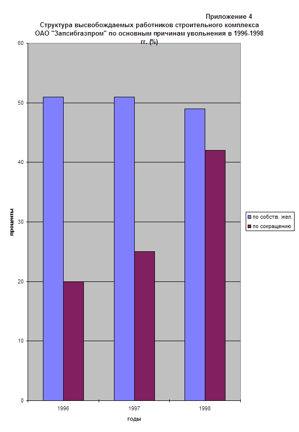 4. Структура высвобождаемых работников строительного комплекса ОАО «Запсибгазпром» по основным причинам увольнений в 1996-1998 гг.