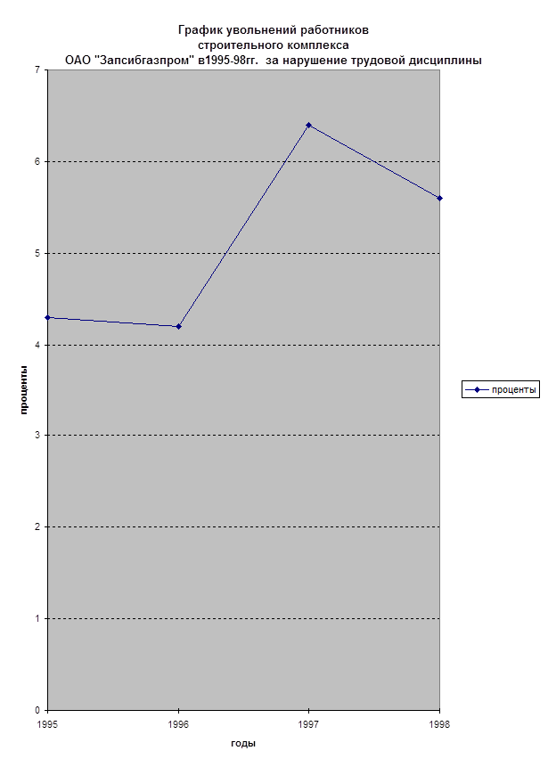 7. График увольнений работников строительного комплекса ОАО «Запсибгазпром» в 1995-1998 гг. за нарушение трудовой дисциплины