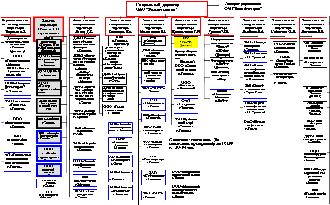 Организационная структура ОАО “ЗАПСИБГАЗПРОМ” на 1.01.1999г.
