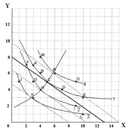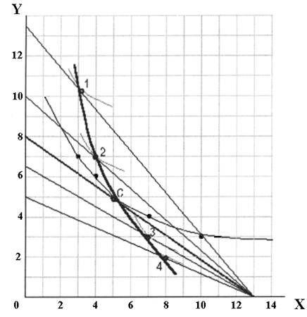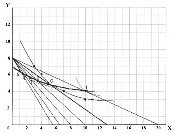 На каждой бюджетной линии есть точка, соответствующая точке потребительского равновесия при текущей цене. Это точки 1, 2, 3, 4, 5 для Икса и 1, 2, 3, 4 для Игрека.