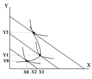 Предположим, что товар Икс (X) – некачественный и доход покупателя увеличивается (C0 - C1 - C2). Это значит, что по отношению к товару Икс кривая "доход-потребление" имеет отрицательный наклон, потому что потребление этого товара будет уменьшаться при повышении дохода (C0 - C1 - C2) - X1<X0 и X2<X1.