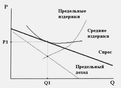 Стремящийся к прибыли монополист использует то же логическое обоснование, что и стремящаяся к прибыли фирма в конкурентной отрасли. Он будет производить каждую последующую единицу продукции до тех пор, пока её реализация обеспечивает больший прирост валового дохода, чем увеличение валовых издержек. Точнее говоря, фирма будет наращивать производство продукции до такого объёма, при котором предельный доход равен предельным издержкам. Другими словами, максимизация прибыли требует равенства предельного дохода и предельных издержек. Таким образом, максимизирующая свою прибыль фирма никогда не будет расширять свои объёмы продаж до величин, когда спрос по цене становится неэластичным. Таким образом МС=MR. (это точка пересечения кривых предельных издержек и предельного дохода на рисунке – Q1 характеризует объём выпуска продукции).