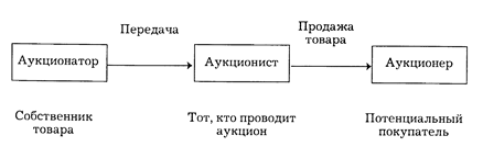Аукционная форма торговли также относится к категории посреднических операций. В осуществлении таких операций участвуют три субъекта взаимоотношений (рис.5).