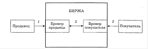 1 — поручение продавца брокеру; 2 — поручение покупателя брокеру; 3 — совершение сделки в соответствии с поручениями продавца и покупателя