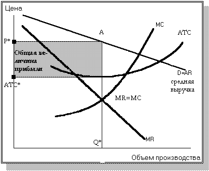 Итак, фирма выбирает объем продукции Q* (рис.3)[6]. Пусть при объеме Q* средние совокупные издержки (ATC) равняются ATC* . Прибыль фирмы в расчете на единицу продукции равняться цене P* минус издержки, или средние удельные издержки ATC* . Следовательно, фирма-монополист с лихвой покроет свои издержки, выбрав объем Q* . Общая величина ее прибыли равняется величине прибыли в расчете на единицу продукции (P* - ATC* ), умноженной на общий объем выпуска (заштрихованная площадь на рис. 3).