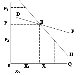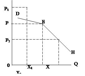 Предположим, что у фирмы цена за единицу продукта ОР, а объем продаж OX (рис. 6а), DEF – кривая спроса на товары фирмы. Она принимает решение повысить цену на свои товары. Новая цена ОР1 . Другой вариант: она понижает цену до ОР2 . Предположим далее, что соперники следуют за фирмой при установлении цен. В таком случае GEH представляла бы кривую спроса фирмы, совпадающую с кривой спроса ее соперников. На практике же, если фирма поднимает цену, соперники не следуют за ней и не повышают цену, с тем чтобы увеличить свою долю рынка за счет фирмы. Если фирма понижает цену, соперники реагируют на такое сокращение, с тем чтобы предотвратить потерю своей доли рынка. Таким образом, завершающая кривая спроса составляется из двух сегментов DE и EH с переломом в точке Е. Сотрем отрезки GE и EF и получим ломаную кривую спроса в данной отрасли DEH (рис. 6б). Фирмы не реагируют на повышение цен и снижают цены вслед за снижением цен одной из них.