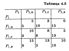 Когда обе фирмы установят на свою продукцию низкие цены, тогда они получат одинаковую прибыль в размере 5 ден. ед. Если при низкой цене на продукцию первой фирмы вторая фирма установит среднюю цену, то прибыль первой фирмы возрастет до 10, а второй снизится до 3 ден. ед. из-за перехода части покупателей от второй фирмы к первой. При P2,B и Р1,H прибыль первой фирмы составит 15, a y второй фирмы прибыли не будет. Второй столбец табл. 1 показывает, как меняются размеры прибыли у каждой из фирм, когда при фиксированной низкой цене на продукцию второй фирмы цена на продукцию первой принимает различные значения. Прибыли дуополистов при других сочетаниях цен представлены в остальных клетках табл. 1.