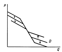 Q^D = a - bP, если P’’ >= P >= P’, a - bP + c(P’’ - P), если P’ > P
