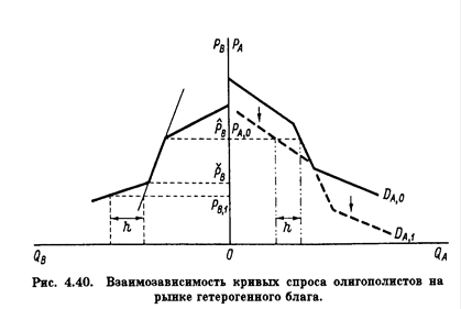 Смещение кривых спроса на продукцию олигополистов отражает тот факт, что в ходе “войны цен” фирмам удается сохранить свой контингент покупателей. В результате смещения кривых спроса цена равновесия на олигопольном рынке гетерогенного блага всегда оказывается внутри интервала {Р’,Р’’}, т. е. на монопольном участке кривых спроса.