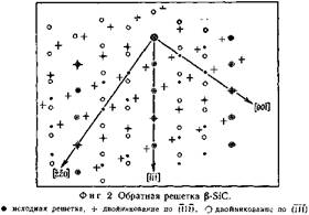 Ребра пластинок β-SiC параллельны направлениям <110>. Вращение кубического кристалла вокруг оси, перпендикулярной наиболее развитой грани пластинки, т. е. вокруг направления <111>, приводит к совпадению направления электронного луча с некоторыми из осей, принадлежащих семействам <110>, <112> и <123>; если осадок ориентирован относительно подложки строго эпитаксиально, при каждом таком совпадении будет наблюдаться соответствующая дифракционная картина. Так как положение направлений <110> подложки может быть установлено визуально по положению столика электронного микроскопа, эпитаксиальный характер осадка может быть подтвержден появлением каждой из указанных дифракционных картин при правильной ортогональной ориентации электронного луча. Это было проделано для полученных пленок. Кроме того, наблюдаемые дифракционные пятна соответствуют узлам обратной решетки β-SiC.
