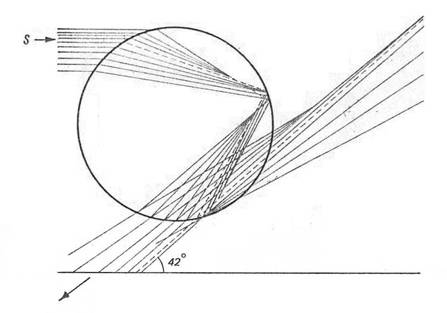 Каждый белый луч, преломляясь в капле, разлагается в спектр, и из капли выходит пучок расходящихся цветных лучей. Поскольку у красных лучей показатель преломления меньше, чем у других цветных лучей, то они и будут испытывать минимальное отклонение по сравнению с остальными. Минимальные отклонения крайних цветных лучей видимого спектра красных и фиолетовых оказываются следующими: D1k= 137°30' и D1ф = 139°20'. Остальные цветные лучи займут промежуточные между ними положения.