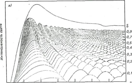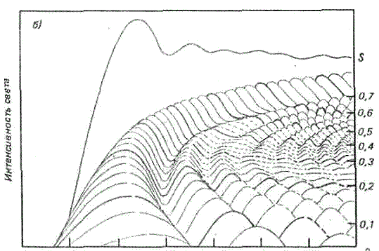 Сложная волнообразная поверхность на переднем плане (рис.3 а) составлена из многих индивидуальных кривых. Каждая кривая дает распределение и интенсивность света в радуге от одной капли. Каждая пятая кривая проведена потолще, цифры справа означают радиус капли, соответствующей кривой, в миллиметрах. Все кривые начинаются слева с очень малой интенсивности (вне радуг), затем быстро поднимаются до максимума между 138° и 139° (первая радуга). Следующий гребень справа — первая дополнительная дуга, за ней вторая дополнительная дуга и т. д. Расстояние между дугами, как видно из рисунка, быстро уменьшается при увеличении радиуса капель. Это действие первого фактора. Радуга становится узкой при увеличении размера капель.