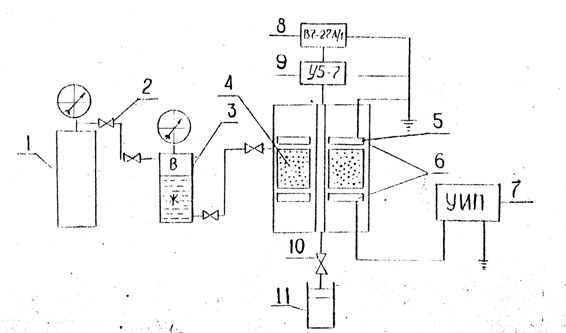Установка включает в себя кернодержатель особой конструкции с пористой средой 4 и электродами 6, электрометрический усилитель 9 с цифровым вольтметром 8, баллон с воздухом 1, колонку 3 с исследуемой жидкостью, источник электрического поля 7, мерный цилиндр 11.
