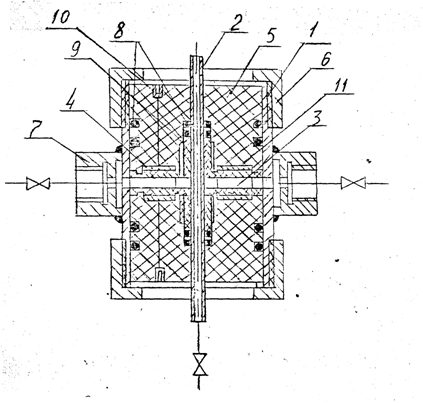 герметизация втулок производиться нефтестойкими кольцами 8, установленными в канавках, прижатыми сальниками 9. Для подачи жидкости в пористую среду служит кольцо 7, в котором имеются посадочные места для вентилей.