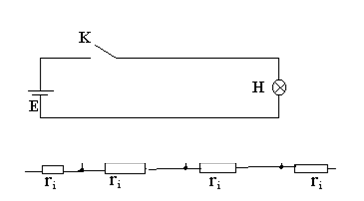 Электрические схемы передачи сигналов. Схема аксона (а) состоит из продольных сопротивлений ri емкости мембраны C сопротивления мембраны rm и источник э.д.с. Em. Техническая система передачи сигналов (б) состоит из источника тока E нагрузки H и выключателя K.