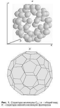 В настоящее время понятие "фуллерены" применяется к широкому классу многоатомных молекул углерода Cn, где n>60, и твердым телам на их основе. Однако еще 6 лет назад фуллереном (точнее бакминстерфуллереном) называли молекулу С60, то есть молекулу, состоящую из шестидесяти атомов углерода, расположенных на сферической поверхности, как показано на рис.1. Как видно из рисунка, атомы углерода располагаются на поверхности сферы в вершинах пятиугольников (пентагонов) и шестиугольников (гексагонов). Эта молекула напоминает футбольный мяч, имеющий 12 черных пентагонов и 20 белых гексагонов. Молекулы С60 могут кристаллизироваться, образуя кубическую решетку. Таким образом, фуллерен является четвертой аллотропной формой углерода (первые три – алмаз, графит и карбин). В дальнейшем для определенности фуллереном мы будем называть твердую фазу С60, а отдельные молекулы С60 – молекулами фуллерена. Как мы уже отмечали, молекула С60 содержит фрагменты с пятикратной симметрией (пентагоны), которые запрещены природой для неорганических молекул. В связи с этим мы должны признать, что молекула фуллерена является органической молекулой, а сам фуллерен представляет собой молекулярный кристалл, являющейся связующим звеном между органической и неорганической материей.