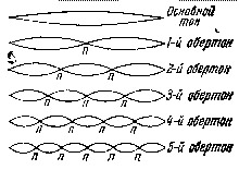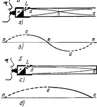 На рис. 14 показано, как получаются в открытой трубе основной топ и первые три обертона. Для основного тона длина
