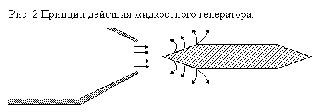 Принцип действия УЗ генератора-свистка почти такой же, как и обычного милицейского свистка, но размеры его значительно больше. Поток воздуха с большой скоростью разбивается об острый край внутренней полости генератора, вызывая колебания с частотой, равной собственной частоте резонатора. При помощи такого генератора можно создавать колебания с частотой до 100 Кгц при относительно небольшой мощности. Для получения больших мощностей применяют газоструйные генераторы, у которых скорость истечения газа выше. Жидкостные генераторы применяют для излучения УЗ в жидкость. В жидкостных генераторах (рис. 2) в качестве резонансной системы служит двустороннее острие, в котором возбуждаются изгибные колебания.