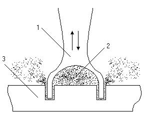 Если между рабочей поверхностью УЗ-вого инструмента и обрабатываемой деталью ввести абразивный материал, то при работе излучателя частицы абразива будут воздействовать на поверхность детали. Материал разрушается и удаляется при обработке под действием большого числа направленных микроударов (рис. 4).
