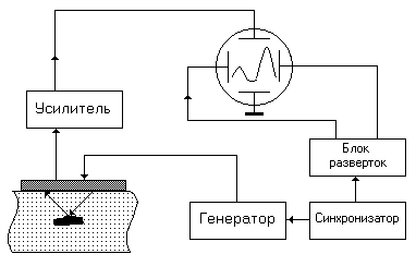 Импульсный метод УЗ-вой дефектоскопии основан на явлении отражения ультразвуковых волн. Принцип действия импульсного дефектоскопа показан на рис. 6. Высокочастотный генератор вырабатывает кратковременные импульсы. Посланный излучателем импульс, отразившись, возвращается обратно к преобразователю, который в это время работает на прием. С преобразователя сигнал поступает на усилитель, а затем на отклоняющие пластины электроннолучевой трубки. Для получения на экране трубки изображения зондирующих и отраженных импульсов предусмотрен генератор развертки. Работой высокочастотного генератора управляет синхронизатор, который с определенной частотой формирует высокочастотные импульсы. Частота посылки импульсов может изменяться с таким расчетом, чтобы отраженный импульс приходил к преобразователю раньше посылки следующего импульса.