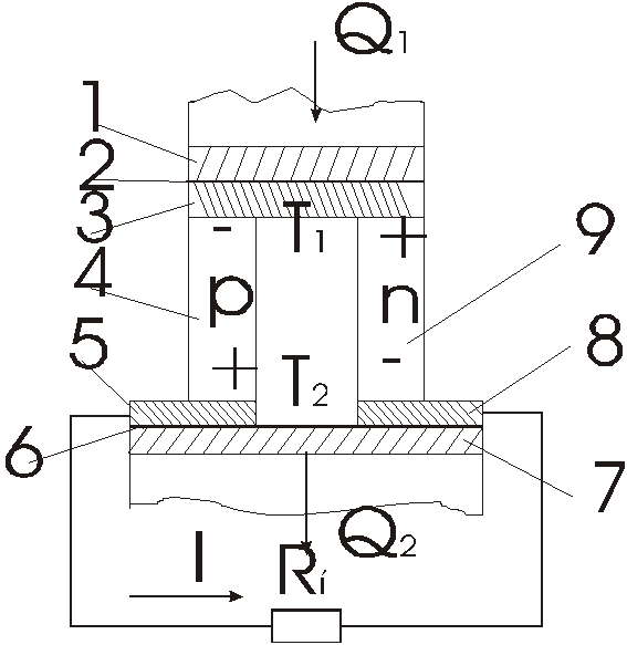 При рабочих температурах Т 900 100 К целесообразны сплавы 20-30% Ge-Si, а при Т 600 800 К - материалы на основе теллуридов и селенидов свинца, висмута и сурьмы. Схема кремниевого ТЭЭ показана на рис. 1. Тепло Q1 подводится к ТЭЭ (ТЭГ) через стенку нагревателя 1 с помощью теплоносителя ( например жидкометаллического), тепловой трубы или при непосредственном контакте с зоной тепловыделения реактора. Через стенку 7 холодильника тепло Q2 отводится от ТЭГ (излучением, теплоносителем или тепловой трубой). Спаи полупроводниковых кристаллических термостолбиков 4 и 9 образованы металлическими шинами 3 и 5, 8, которые электрически изолированы от стенок 1 и 7 слоями диэлектрика 2, 6 на основе оксидов температур Т = Т1-Т2.
