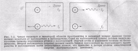 Это означает также, что число тахионов, находящихся в некоторой области пространства, должно меняться от наблюдателя к наблюдателю (рис. 7.2). Предположим, что один из наблюдателей видит процесс испускания тахиона атомом с последующим удалением тахиона на бесконечность. Другой наблюдатель может наблюдать тот же процесс так, как будто тахион прилетает из окружающего пространства и поглощается атомом. Поэтому между этими двумя наблюдателями будут разногласия относительно числа тахионов, присутствующих в системе в прошлом и в будущем. Такая ситуация опять-таки не похожа на ситуацию с обычными частицами, когда число частиц, имеющихся в произвольный момент времени,