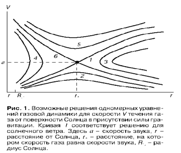 На этом рисунке через a обозначена скорость звука, r* - расстояние от начала координат, на котором скорость газа равна скорости звука (V = a). Очевидно, что только кривые 1 и 2 на рис1. имеют физический смысл для проблемы истечения газа из Солнца, поскольку кривые 3 и 4 имеют неединственные значения скорости в каждой точке, а кривые 5 и 6 соответствуют очень большим скоростям в солнечной атмосфере, что не наблюдается в телескопы. Паркер проанализировал условия, при которых в природе осуществляется решение, соответствующее кривой 1. Он показал, что для согласования давления, получаемого из такого решения, с давлением в межзвездной среде наиболее реален случай перехода газа от дозвукового течения (при r < r*) к сверхзвуковому (при r > r*), и назвал такое течение солнечным ветром.