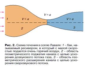 Проведем аналогию с классическим течением в сопле Лаваля, которое представляет собой основу всех сверхзвуковых реактивных двигателей. Схематически это течение показано на рис.2. В бак 1, называемый ресивером, с очень маленькой скоростью подается газ, нагретый до очень высокой температуры (внутренняя энергия газа много больше кинетической энергии направленного движения). Путем геометрического сжатия канала газ ускоряется в области 2 (дозвуковое течение) до тех пор, пока его скорость не достигнет скорости звука. Для дальнейшего его ускорения необходимо канал расширять (область 3 сверхзвукового течения). Во всей области течения ускорение газа происходит за счет его адиабатического (без подвода тепла) охлаждения (внутренняя энергия хаотического движения переходит в энергию направленного движения).