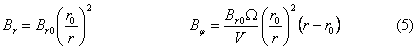 В формулах (5), описывающих паркеровскую спираль Архимеда для межпланетного магнитного поля в плоскости солнечного экватора, почти совпадающей с плоскостью эклиптики, величины Br, Bj - радиальная и азимутальная компоненты вектора магнитной индукции, W - угловая скорость вращения Солнца, V – радиальная скорость солнечного ветра, индекс 0 относится к точке солнечной короны, в которой величина магнитного поля известна.