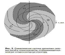 Рассмотренное ранее представление об истечении плазмы из солнечной короны исходит из предположения о том, что солнечная корона является однородной и стационарной, то есть ее температура и плотность не зависят от солнечной долготы и времени. В этом случае солнечный ветер можно рассматривать как сферически – симметричное (зависящее только от гелиоцентрического расстояния) стационарное течение. До 1990 года все космические аппараты летали вблизи солнечной эклиптики, что не позволяло прямыми методами измерений проверить степень зависимости параметров солнечного ветра от солнечной широты. Косвенные же наблюдения отклонения хвостов комет, пролетавших вне плоскости эклиптики, указывали на то, что в первом приближении такой зависимости нет. Однако измерения в плоскости эклиптики показали, что в межпланетном пространстве могут существовать так называемые секторные структуры с различными параметрами солнечного ветра и различным направлением магнитного поля. Такие структуры вращаются вместе с Солнцем и явно указывают на то, что они являются следствием аналогичной структуры в солнечной атмосфере, параметры которой зависят от доготы. Качественно четырехсекторная структура показана на рис.3.