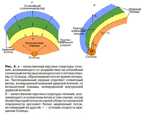 Когда быстрый поток догоняет медленный, то в месте их соприкосновения возникает произвольный разрыв параметров, на котором не выполняются законы сохранения массы, импульса и энергии. Такой разрыв не может существовать в природе и распадается, в частности на две ударные волны и тангенциальный разрыв (на последнем нормальная компонента скорости непрерывны), как это показано на рис.4,а для вспышечного процесса на Солнце и на рис.4,б в том случае, когда более быстрый поток от одной области солнечной короны догоняет более медленный, вытекающий из другой. Ударные волны и тангенциальные разрывы, изображенные на рис.4, сносятся солнечным ветром на большие гелиоцентрические расстояния и регулярно регистрируются космическими аппаратами.