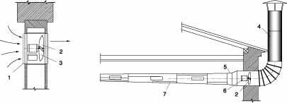 Рис 5. Простейшие схемы вытяжной вентиляции: 1 — утепленный клапан; 2 — вентилятор; 3 — лопасти вентилятора; 4 — вытяжная шахта; 5 — шибер; 6 — электродвигатель; 7 — вытяжная сеть. |