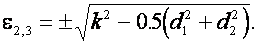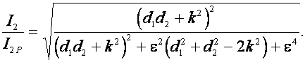 Если первый корень (e1) действителен при любых соотношениях между k и d, то второй и третий корни (e2 и e3) имеют смысл только при k > d. При k<d подкоренное выражение будет мнимым и физического смысла не имеет. В этом случае физический смысл имеет только первый корень (e1), что говорит об одногорбости резонансной характеристики для I2. При k > d физический смысл имеют все три корня, что говорит о двугорбом характере резонансной характеристики для тока I2. Очевидно, вторичный критический коэффициент связи, лежащий на границе перехода от одногорбой кривой к двугорбой, на основании (21) получается тогда, когда корни (21) обращаются в нуль: