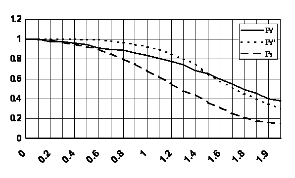 График зависимости вероятности безотказной работы системы от времени наработки, системы после увеличения надёжности элементов PS’ и после увеличения надёжности элементов PS’ и после структурного резервирования PS’’.