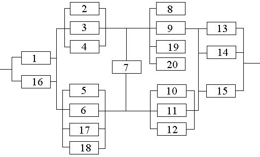 б) нагруженное резервирование основных элементов 1, 2, 3, 4, 5 и 6 идентичными по надежности резервными элементами 16, 17, 18,19 и 20 .