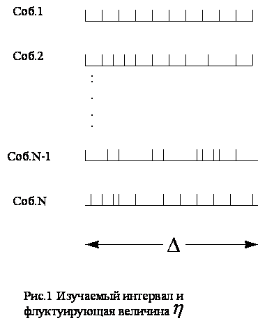 Пусть у нас имеется N событий в которых исследуемая величина (h) сильно флуктуирует (Рис.1). Этот процесс может быть описан путем деления соответствующего интервала D на M (для определенности) интервалов величиной