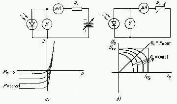 Рис. 2.4. Схемы измерения и семейства вольт-амперных характеристик в фотодиодном (а) и фотовентильном (б) режимах работы диода. |