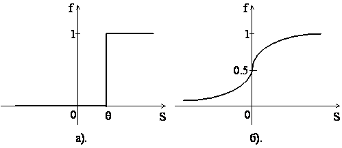 где q - некоторое постоянное смещение (аналог порога нейрона). Обычно используются простейшие нелинейные функции: бинарная (рис. 1.2, а)