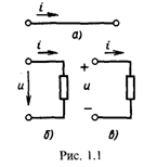 Напряжение как отношение двух скалярных величин также является скалярной алгебраической величиной. Для однозначного определения знака напряжения между двумя выводами рассматриваемого участка цепи одному из выводов условно приписывают положительную полярность, которую отмечают либо стрелкой, направленной от вывода, либо знаками «+», «-» (рис. 1.1, б, в). Напряжение положительно, если его полярность совпадает с выбранной; это означает, что потенциал вывода со знаком «+», из которого выходит стрелка, выше потенциала второго вывода.
