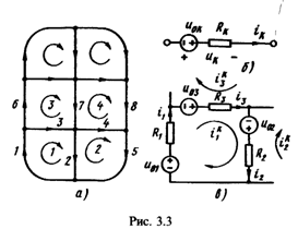 Метод контурных токов применим к цепям с планарным графом (рис. 3.3, а). В качестве переменных принимают замкнутые контурные токи, проходящие по ветвям, образующим все внутренние ячейки графа.