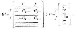 Более рационально формировать матрицуGy и вектор iy непосредственно - по мере поступления данных составных ветвей, исходя из смысла собственной и взаимной проводимостей. Вначале матрицу узловых проводимостей и вектор узловых токов принимают равными нулю: Gy=0 и iy=0, затем к ним добавляют элементы, вносимые каждой составной ветвью. Данные ветви (k, i, j) с проводимостью Gk и током источника тока iok войдут в собственные проводимости Gii, Gjj, узлов i, j как добавки Gk, во взаимные проводимости Gij, Gji как добавки Gk и в элементы вектора узловых токов iyi, iyi - как добавки ±i0k. Добавки ветви в матрицу проводимости Gy и вектор тока iy можно представить в виде: