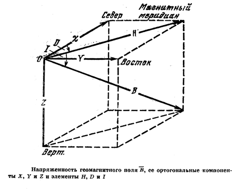 Используется также разложение В на северную (X) и восточную (Y) составляющие вектора Н. Третьей служит вертикальная составляющая Z, которая считается положительной, если В направлено вниз. Напряженности B, H, Z, X, Y измеряются в гауссах (Гс) или гаммах (g). 1g=10-5Гс. Углы D и I измеряются в дуговых градусах и минутах. Все приведенные семь величин В, Н, D, I, X, У, Z называются магнитными элементами. Соотношения между ними ясны из рисунка.