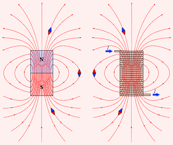 Линии магнитной индукции полей постоянного магнита и катушки с током
