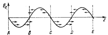 Рис. 1. К группировке электронов электрическим полем продольной составляющей замедленной бегущей волны. Распределение Ez(z) показано при t=0.