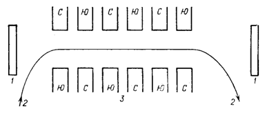 Рис. 2. Схема лазера на свободных электронах: 1 – зеркала, 2 – электронный пучок, 8 – магнитный ондулятор; С и Ю – северный и южный полюсы магнитов ондулятора.
