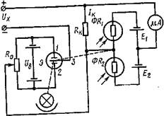 При подключении измеряемого напряжения Ux подвижная часть электрометра Э повернется на некоторый угол, что приведет к перераспределению световых потоков, освещающих фоторезисторы ФRl