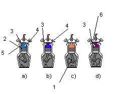 1. Такт впуска (рис.1 a)). По мере того, как коленчатый вал двигателя делает первый полуоборот, поршень 2 перемещается от ВМТ к НМТ, впускной клапан 4 открыт, выпускной клапан 3 закрыт. В цилиндре создается разряжение 0.07 - 0.095 МПа, вследствие чего свежий заряд горючей смеси, состоящий из паров бензина и воздуха, засасывается через впускной газопровод 5 в цилиндр и, смешиваясь с остаточными отработавшими газами, образует рабочую смесь.