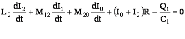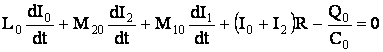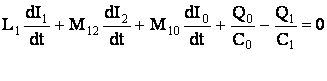 Мы можем ввести индуктивности всех этих контуров соответственно L1, L0 и L2. Кроме того мы можем ввести коэффициенты взаимоиндукции между этими контурами. М12 - коэффициент взаимоиндукции между контуром перезарядки накопителя на обостритель (С1, L1, С0) и контуром разряда накопителя на межэлектродный промежуток (С1, L2, R). М10 - между контуром раряда обострителя на межэлектродный промежуток (С0, L0, R) и контуром перезарядки накопителя на обостритель (С1, L1, С0). М20 - между контуром (С1, L2, R) и контуром (С0, L0, R). Можно записать систему уравнений для контурных токов, которая будет описывать работу системы возбуждения: