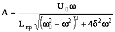 Из выражения (12) видно, что зависимость амплитуды А от частоты ω имеет резонансный характер, причем максимум амплитуды достигается при ω=ω0 (если считать, что ω0 фиксирована и параметры цепи предыонизации постоянны). В случае фиксированной частоты ω максимум амплитуды А также имеет место при ω0=ω (в этом случае для получения резонанса меняются параметры контура предыонизации).